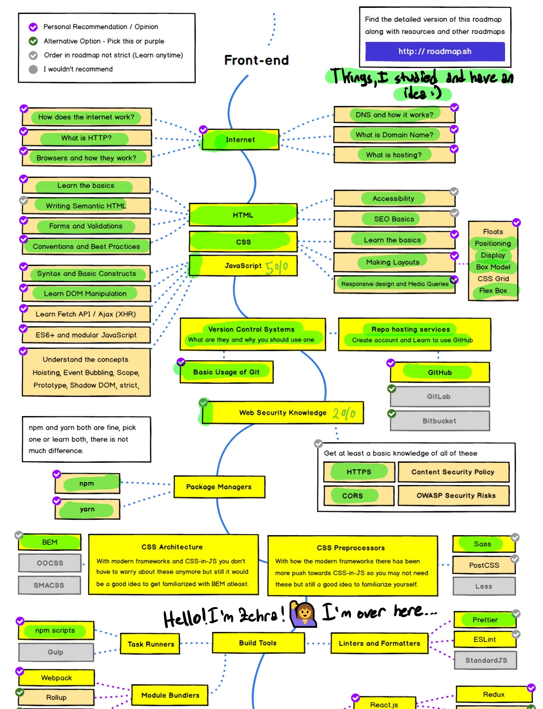 I'm following the Frontend Developer Roadmap as my guide to explore and learn the technologies that I'll need. Here is an overview of where I currently stand.